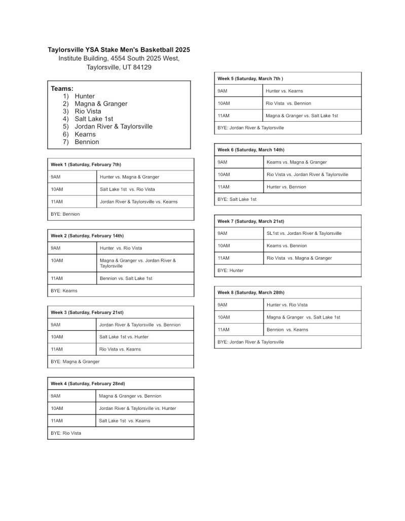 - Men's Basketball: Saturday Mornings, Combined with the Jordan River Ward, February 7th - March 28th at the Institute Building (4554 S 2025 W)